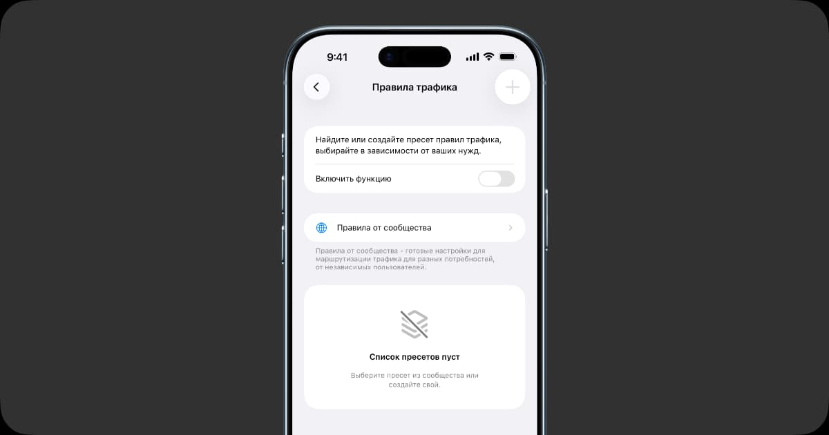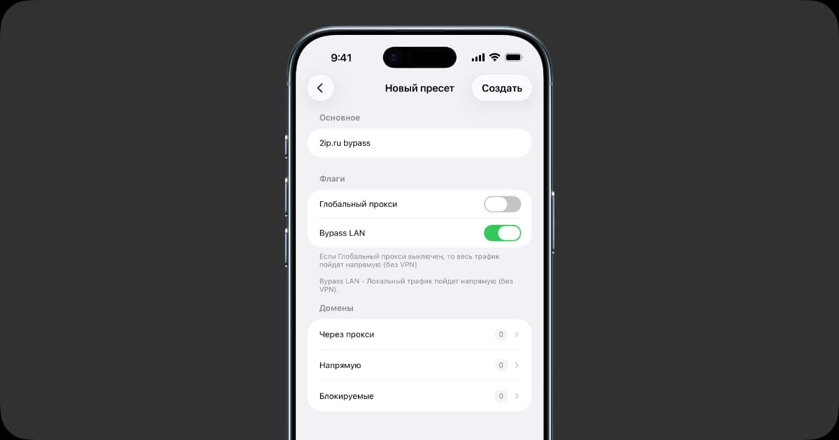 В v2RayTun есть готовые пресеты, которые позволяют отключать VPN-трафик для отдельных доменных зон или приложений.