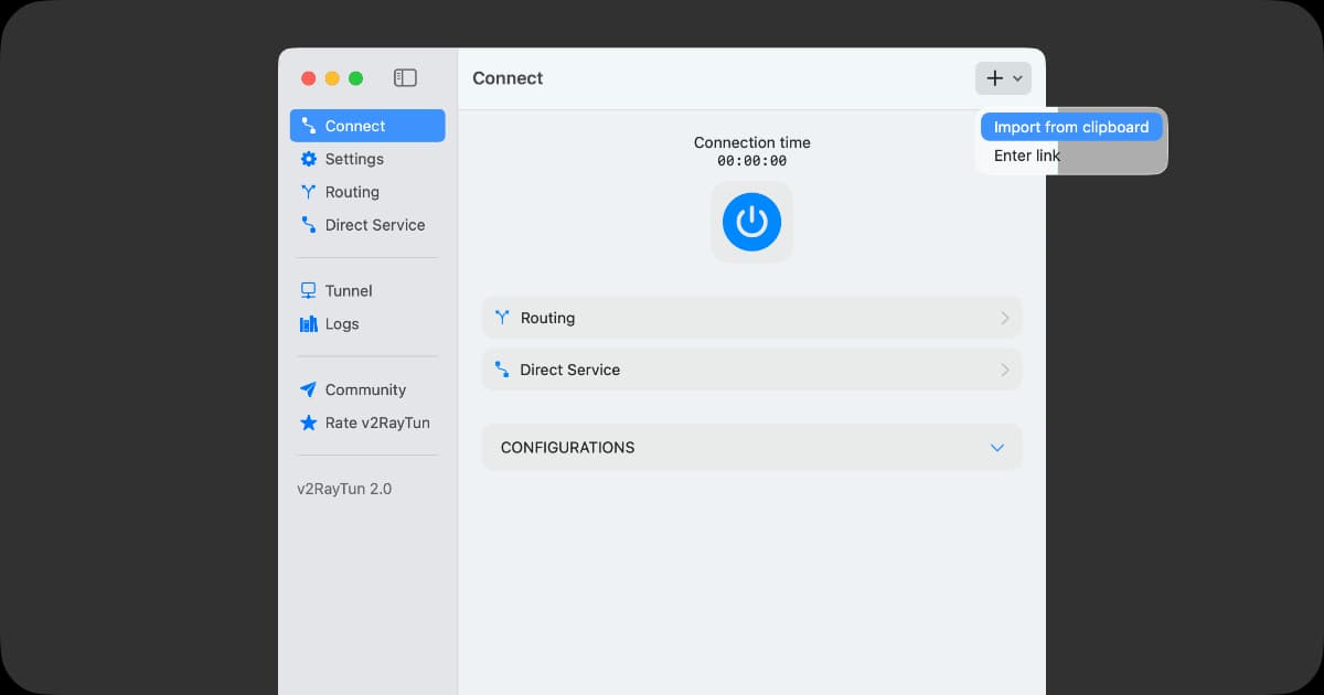 Теперь откройте приложение v2RayTun, нажмите на кнопку «+», а затем выберите «Import from clipboard»