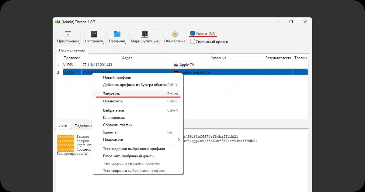 После добавления подписки запустите нужный конфиг — нажмите на него правой кнопкой мыши и выберите Запустить. Затем включите приложение, установив режим TUN.