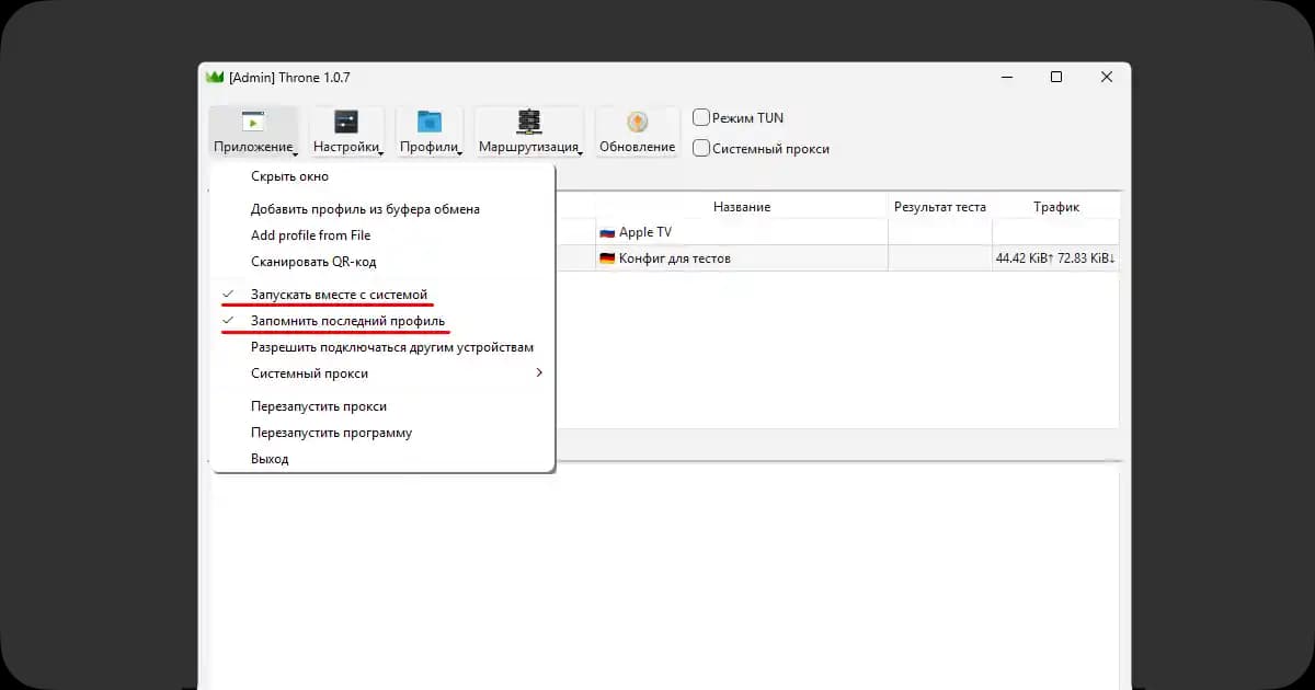 - Включите «Режим TUN при запуске» — без этой галочки VPN не будет работать автоматически