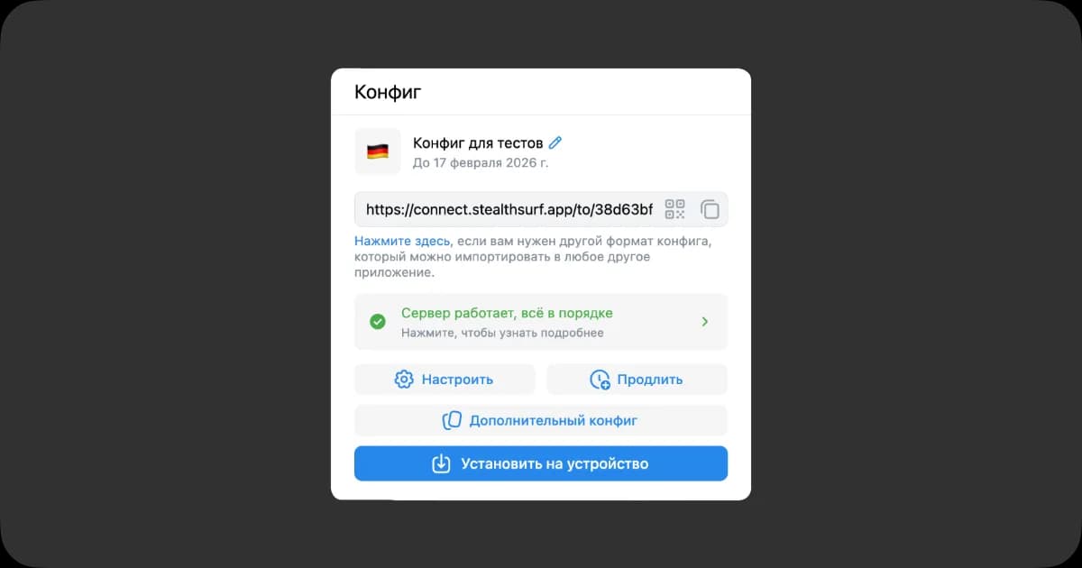 Скопируйте адрес установки из консоли — он начинается с connect.stealthsurf.space....