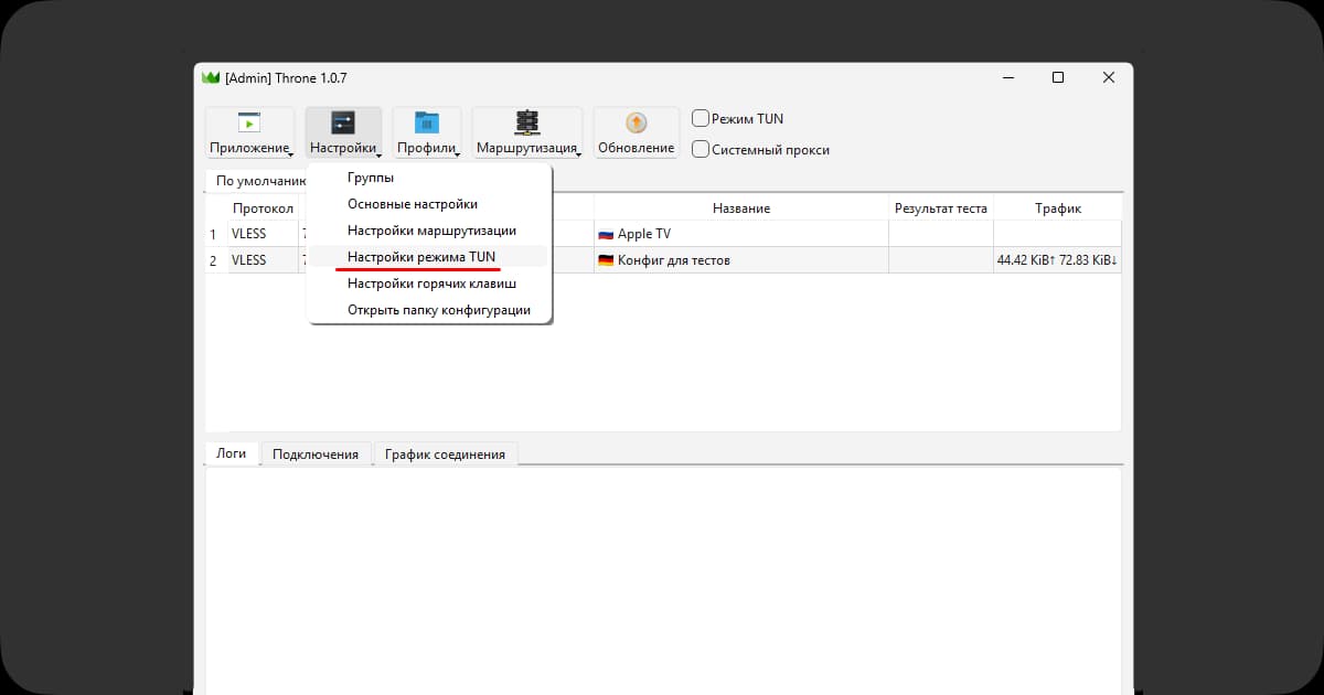 - Перейдите в раздел Настройки → Настройки режима TUN.